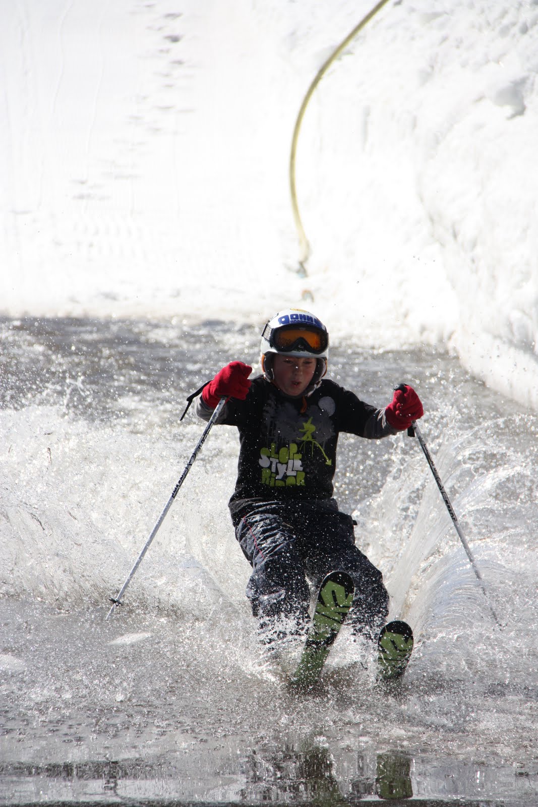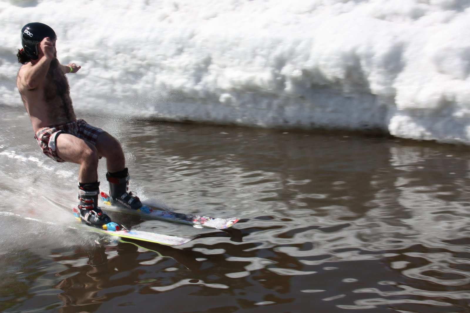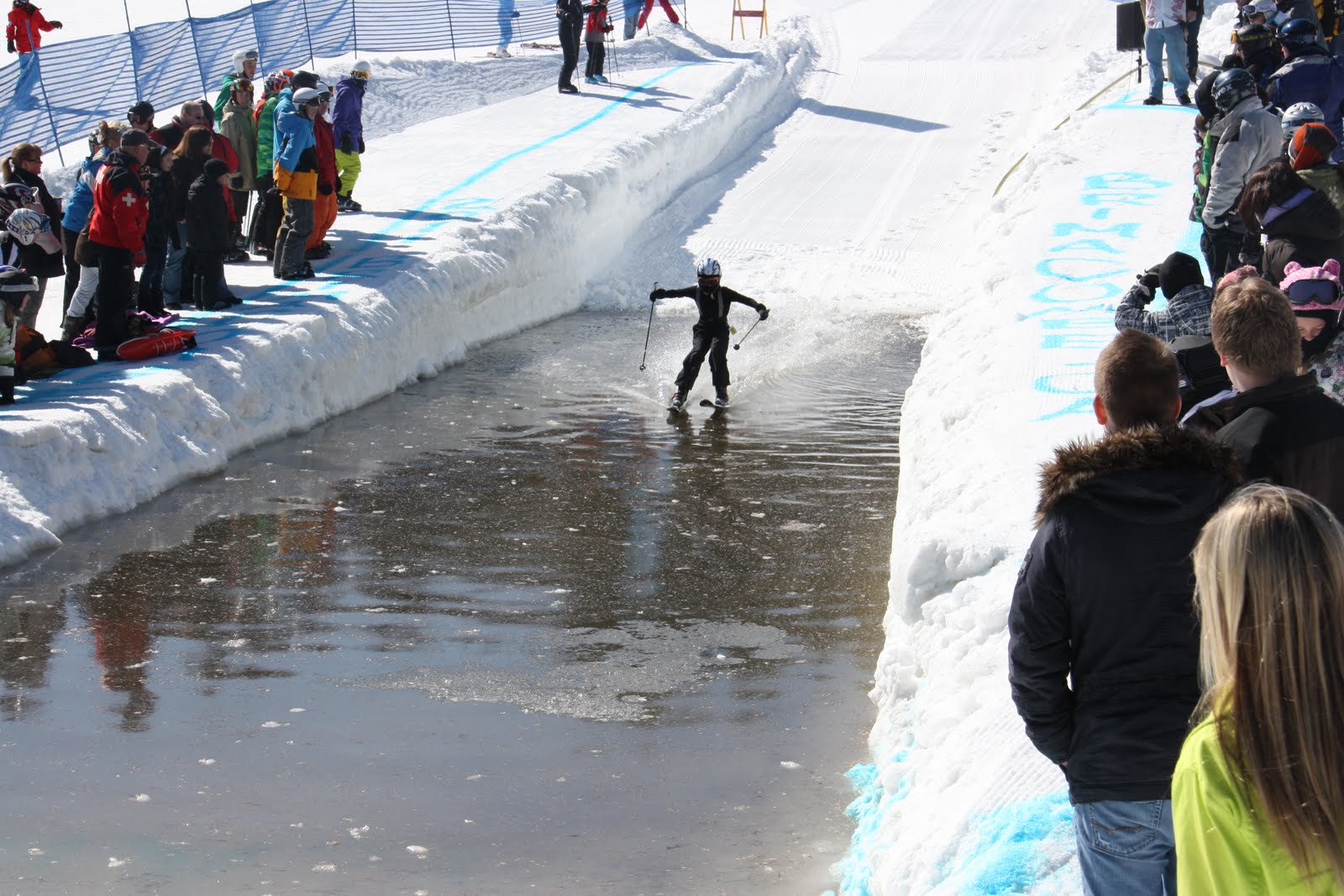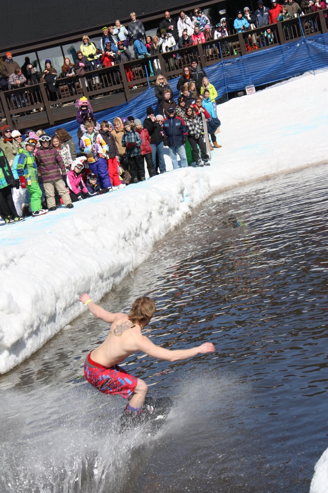 The weather was perfect, the snow was the best it has ever been at the end of any recent season and we thank everyone who came out this weekend for helping us wrap up the 2010 2011 season with a SPLASH! We had a TON of fun today at our 6th ANNUAL PUDDLE JUMP, I think it's safe to say that we had a record attendance with both spectators and competitors! The weather was sunny but cool, and the water....well...it was cold! Here are some shots of today's event,