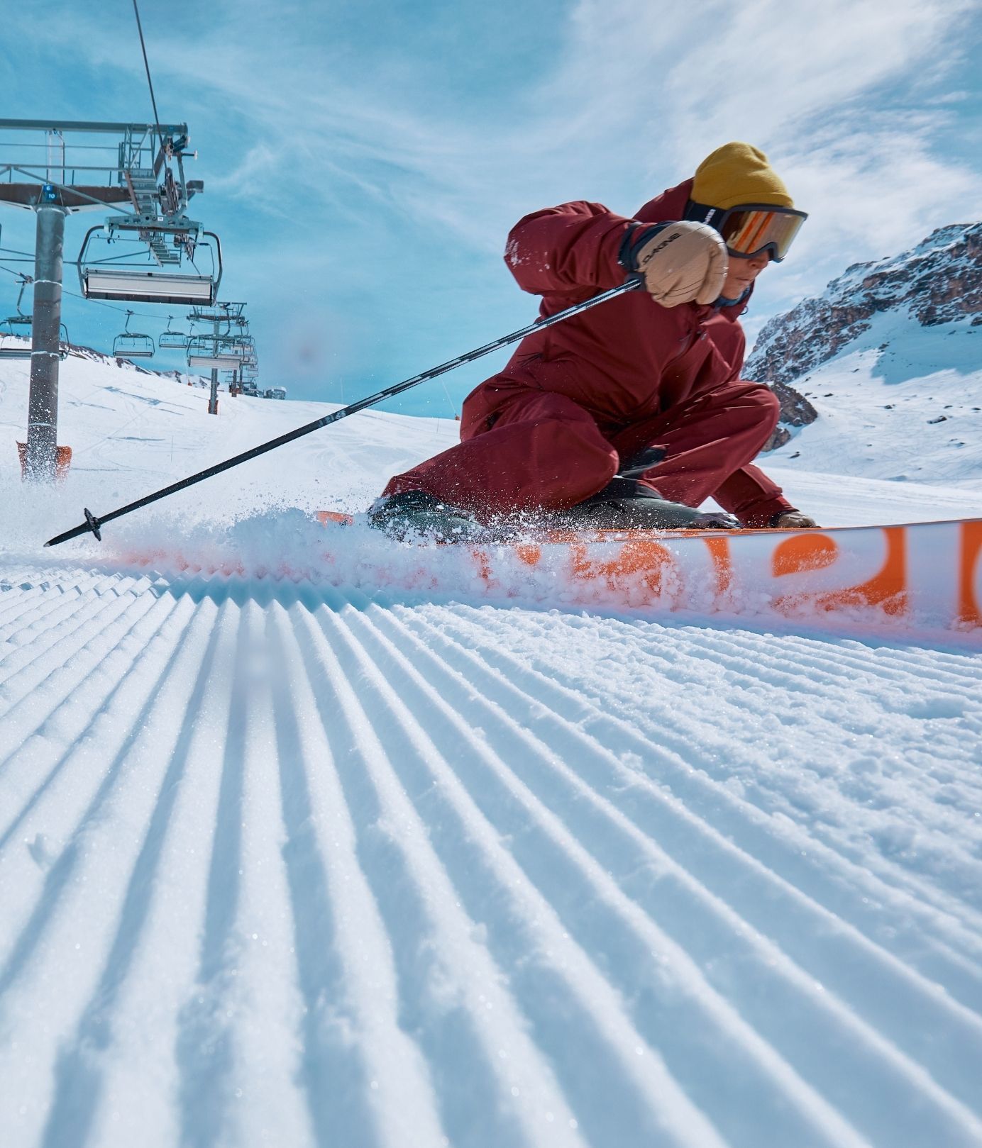 “I’ve got this street spot in mind where there’s a little narrow ledge that turns really sharply onto a rail. I think that with a normal ski, I wouldn’t manage to set the edge and turn quick enough to stay on top but with the Mirus I’ll be able to turn really quickly before the rail. For butters they seem really cool, and responsive too, if there are several rails in quick succession you can quickly carve between the kickers for example.”