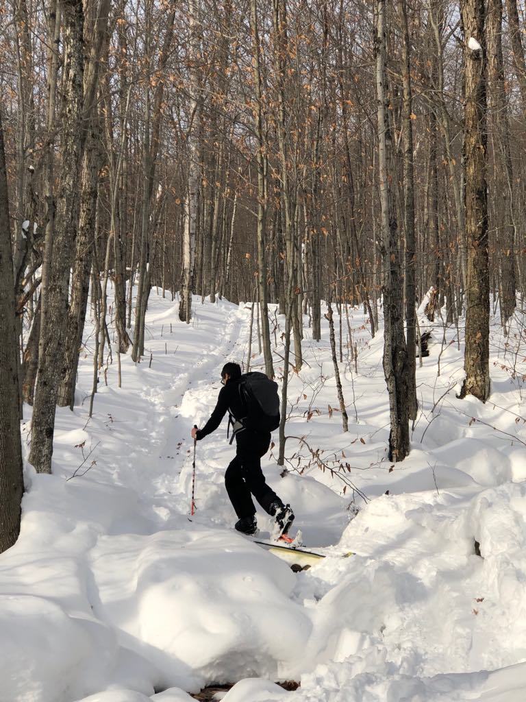 As you can see, pretty easy for my situation. Note I didn’t remove my skins there, just wanted to show that taking these off is pretty smooth. I would expect this to be tougher on a sketchy peak or in heinous weather conditions. Once they’re off and you’re in ski mode, another downside to Daymakers is the added weight to your backpack. A pair weighs 1,380g, so just a bit less than a 1.5L bottle of water so they’re not that heavy, but you obviously want to pack as light as possible to enjoy the ride. I would also imagine that skinning to a jump session, Daymakers are the best setup. You can just leave your adapters in your pack with the rest of your stuff while you hike and hit the jump with your prime ski/binding combo.