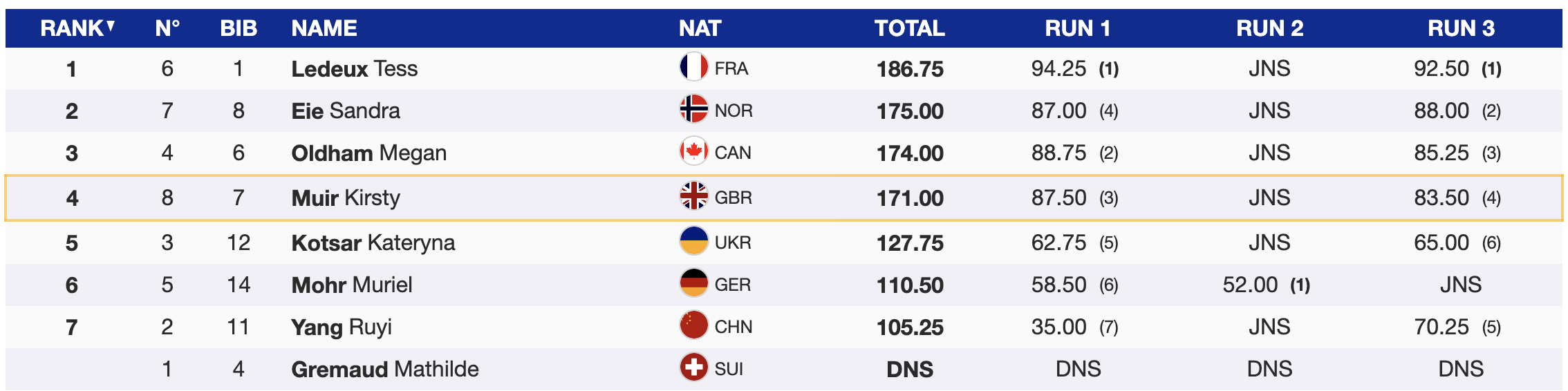 Run 2 saw the speed drop off a cliff and it was hard to improve. Sandra Ei was almost the only one to to land, a 720. Tess went close but backslapped out of a switch dub 9. Kirsty Muir came through clutch in the storm, putting down a right dub 10, slightly sketchy but enough to give her the lead.