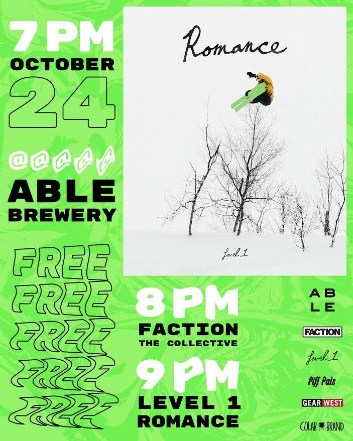 We're dropping two killer ski films to build the stoke for the coming season. Honored to work with Faction Skis for the first time to premiere their new film, The Collective. And of course, we're amped to work with Level 1 to launch their final feature film, Romance. Gonna be a rad night of beer releases, sendy vibes, free giveaways from our buds at Gear West, and bbq from Animales Barbeque Co.