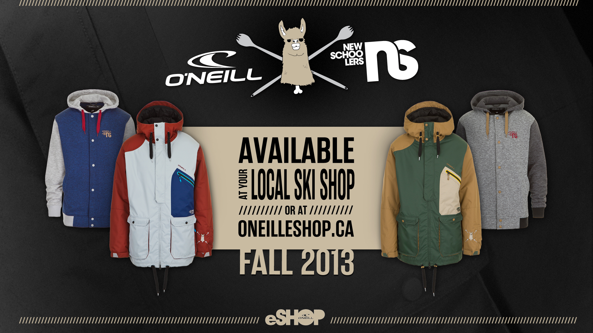 The O’Neill-Newschoolers collab includes two jackets and two fleece styles, all inspired by the growing freeski movement and Team O’Neill freeskiers, David Wise and Aspen Spora. Key features of the jacket include Frontline Green and Metal Grey colorways with a custom long fit design, critically taped seams, venting, storm placket and a fixed hood/chinguard combo for extra protection from the elements. An audio pocket zip and connector system allows for easy MP3 player or smartphone hookup, while lift pass and goggle pockets, along with a secret stash compartment, provide secure locations for valuable items. The O’Neill-Newschoolers fleece styles have been designed to match the jackets in New Steel Grey and Atlantic Blue colorways, along with technical moisture wicking fabric, long fit, heathered tech fleece and hoods with drawstrings in the color of its partner jacket. All products in the collection feature O’Neill and Newschoolers patches on the front left side and a unique ‘llama and spork’ logo on the sleeve and back label, a nod to the early days of Newschoolers.