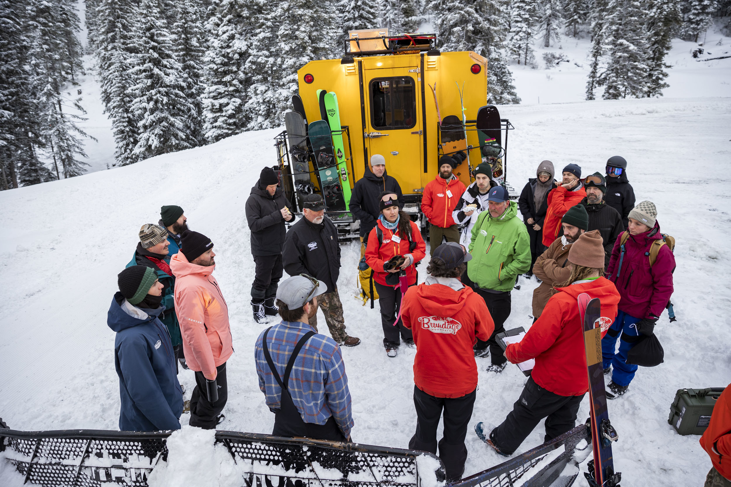 The next morning, you can imagine the wake-up call at 6:30 for cat skiing was brutal. As I approach my mid-thirties, hangovers just hit differently and they keep getting worse. Our crew was beat before the day had even started, chugging cans of Liquid Death on the way up to Brundage Ski Resort. We were picked up by two cats at the base that drove us up to zones around Brundage about 45 minutes away. If the hangover wasn’t enough for you to break a sweat, try adding motion sickness from the cat ride. We all put our game faces on, but I think the whole crew knew deep down what each of us were going through.