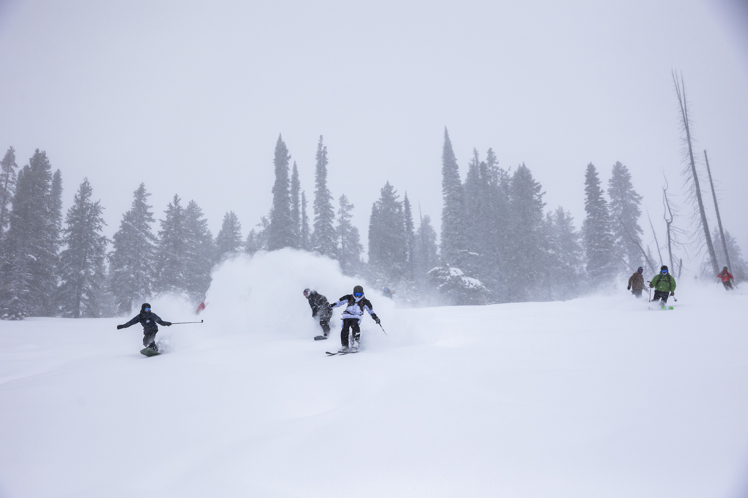 But that all changed once we first stepped off the cat and into skis/boards. Idaho had had a rough start to the season, like most places in North America. But the area had gotten 12” overnight which properly reset the scene for what turned out to be the best day of the season for everybody along for the ride. Our first turns through the untouched terrain pivoted everybody’s energy levels. Nothing else mattered and the stoke was back to being through the roof. We had that terrain all to ourselves and nobody ever had to ski through another’s tracks. Fresh lines fucking everywhere.