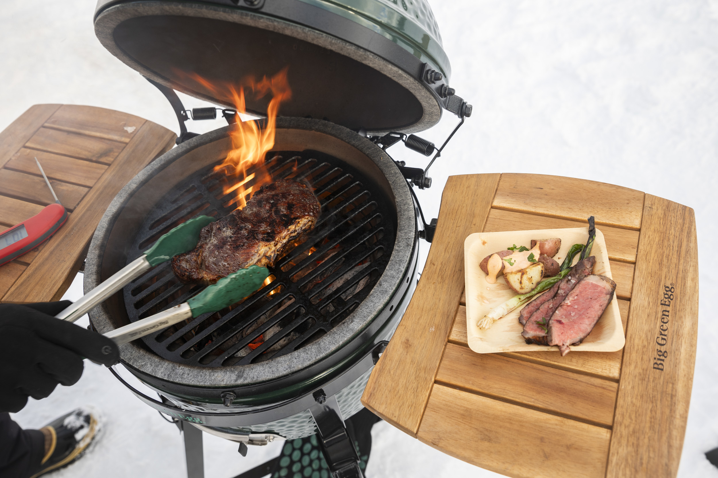 At the end of the afternoon, we were expected by the folks at Big Green Egg and Snake River Farms for a tailgate in the Brundage parking lot. Most people stick to hot dogs for a tailgate, but forget the status quo with these guys. They had three BBQs lit for cooking some epic Wagyu New York strip steaks steaks: two at low heat, about 200-250° and one at very high heat. The two low heat grills were slowly bringing the steaks up to temperature, while the hot grill seared them to perfection. Pair that with some parking lot Pub Beer cans at sunset; it just doesn’t get any better than that.