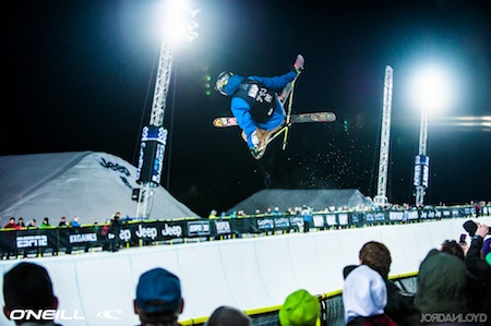 O'Neill Experience star David Wise gets high above the X Games crowd in the Ski SuperPipe on Friday night. Photo by Jordan Loyd/O'Neill Snow