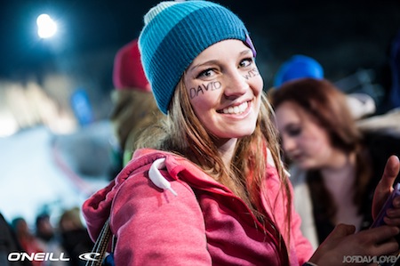 Alexandra Wise cheers on her husband David before his gold medal performance in Ski Superpipe on Friday night. Photo by Jordan Loyd/O'Neill Snow