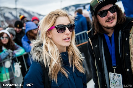 Celia Miller and O'Neill Team Manager Jimmy Adams were at the Slopestyle course on Saturday to watch Max Parrot take silver. Photo by Jordan Loyd/O'Neill Snow