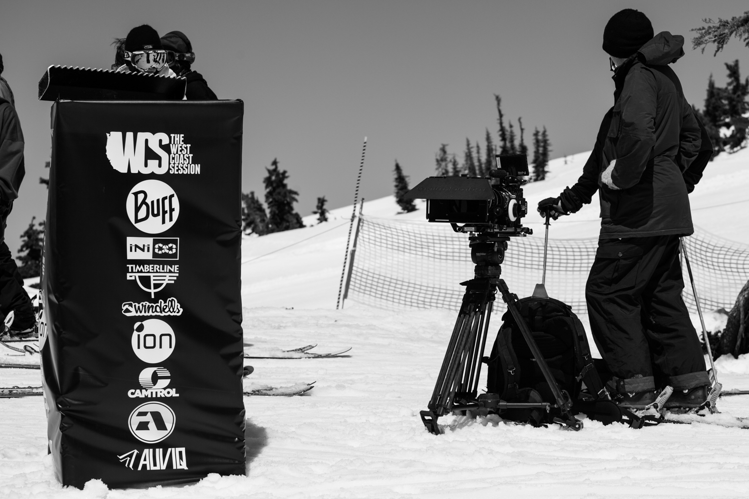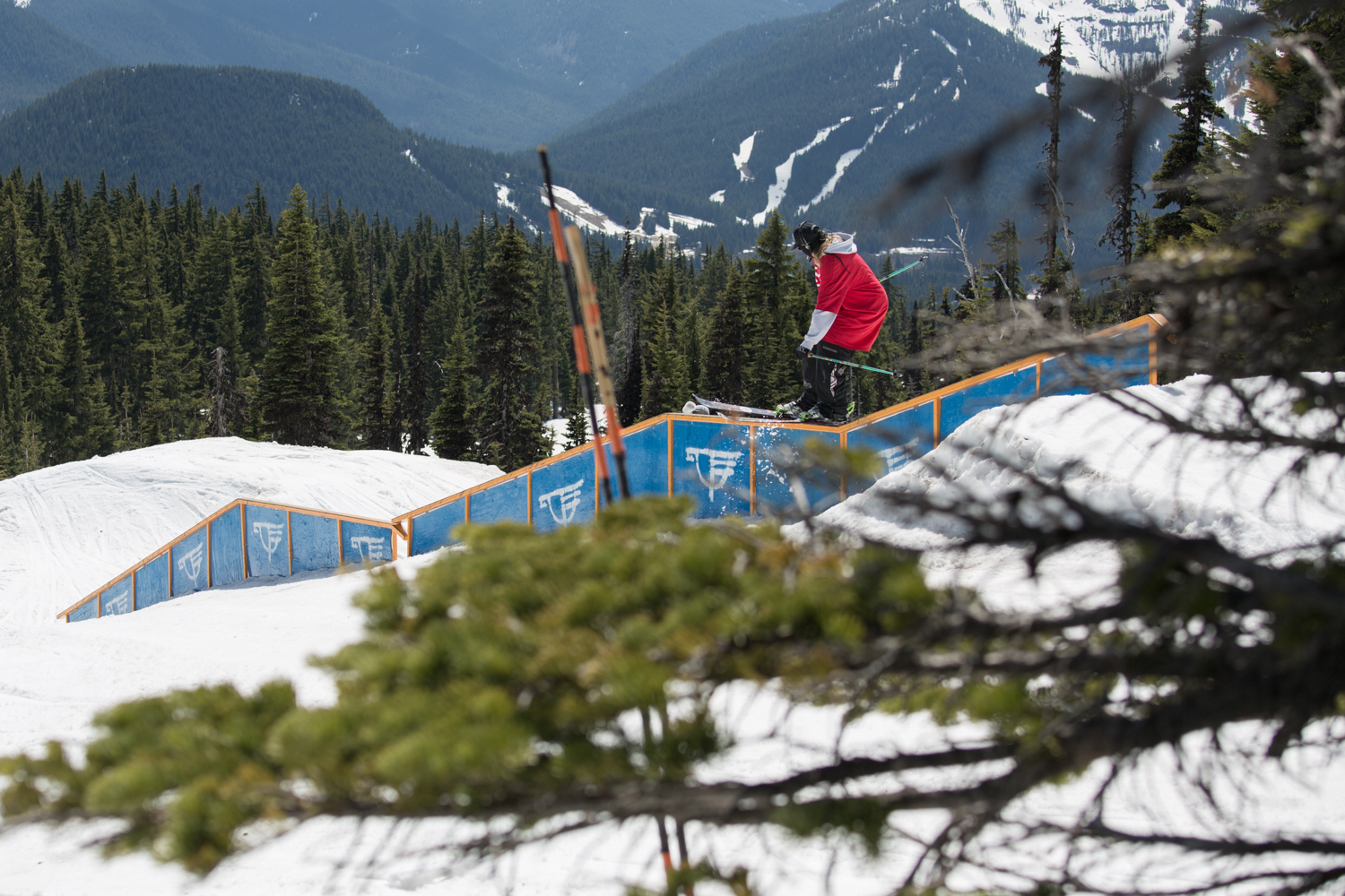 In no time, the huge group of skiers brought their skills to the many jumps and style to the various technical rail features that lined the paintbrush trail, and with bluebird conditions the film crews and photographers had no problem stacking plenty of media. Some of the notable features include a quad kink rail, cannon box, "S" tube, and a few well constructed jumps that attracted quite a bit of attention as the day went on.