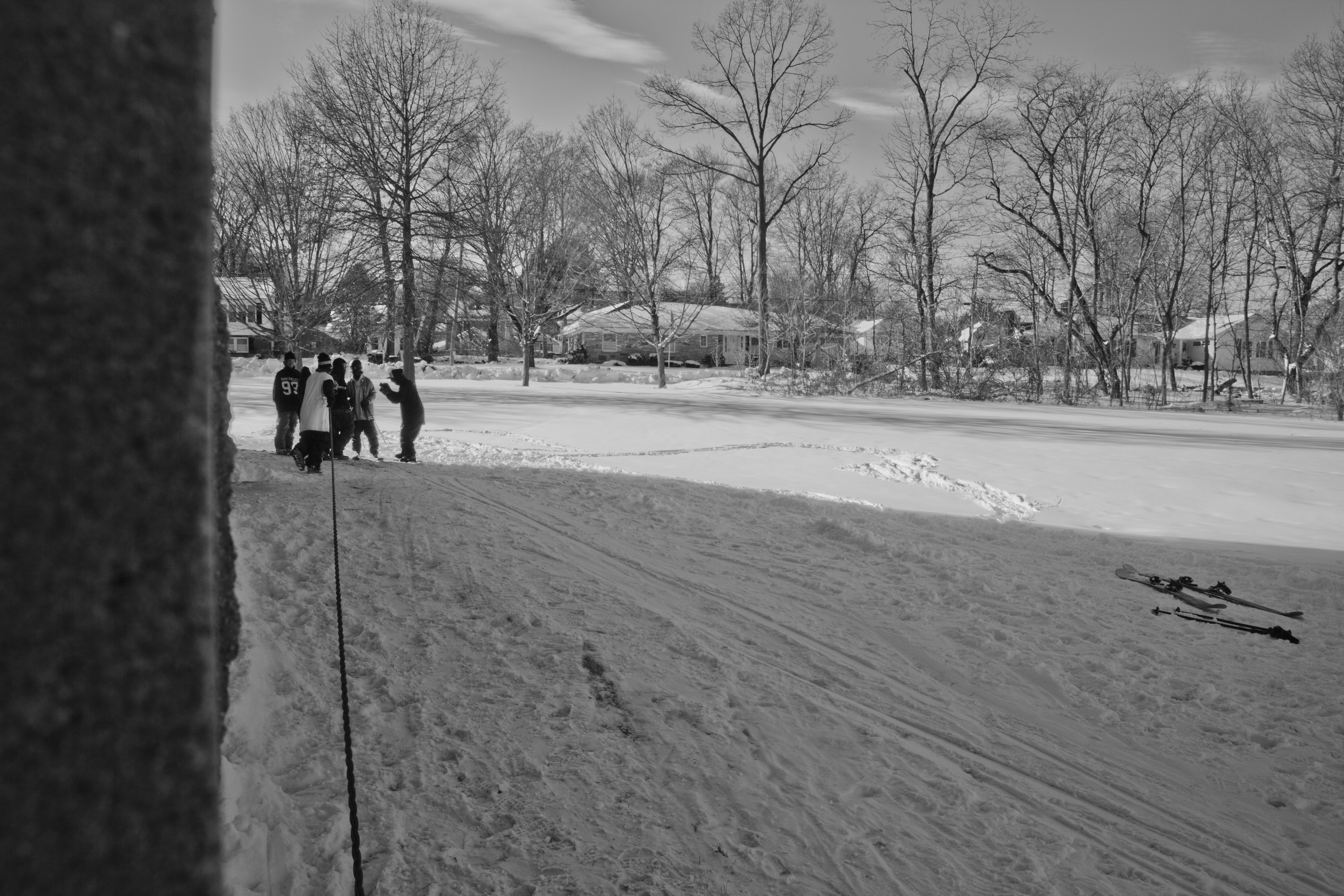 Connor: But we were still set on hitting it. So we tie the bungee up. Charlie sets the bottom angle up on the tripod at the bottom and his fisheye ready to go in the middle on a shovel. I put my skis on and side step the bungee back while Charlie helps pull. Once its back far enough I sit down holding the bungee while Charlie runs and hits record on the tripod and then runs to man the fish eye.
