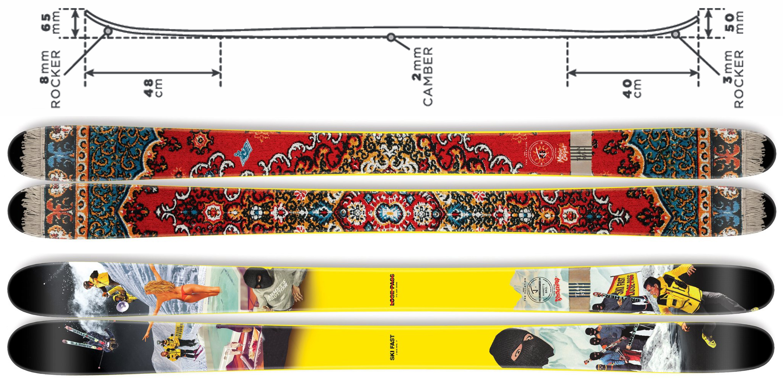 The Vacation is the ultimate get away. . . from traditional stiff fat skis. If your idea of fun is to slash, butter, press, air, nollie & jib throwing tricks all the way down the hill from untracked pow to the groomers and everywhere in between, it’s time for a Vacation! This is one of the widest skis you’ll find with such a soft flex pattern turning boring terrain into a jibbers playground, coupled by deep sidecut for arcing mind blowing carves (like a futuristic version of “Elixabeth”). Giray Dadali AKA "Ahmet's Brother" style of jibbing the entire mountain from the pow to the park was a huge inspiration while developing this ski.