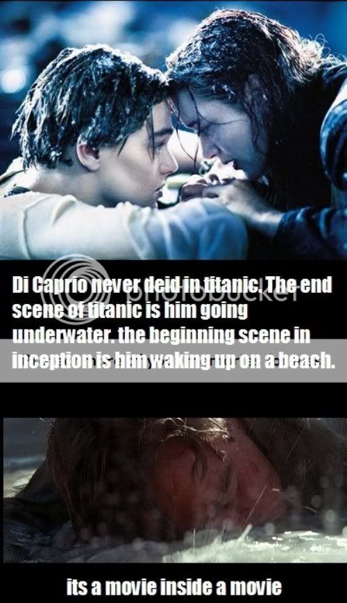 I finally understand what happened to Leonardo Dicaprio in titanic, since he was the main character he obviously couldn't die, it was really just a dream and when he sunk underwater it was really him falling into limbo and he finally gets out of it which is the beginning of inception when he is finally out of the ocean. so really its true inception: a movie within a movie.