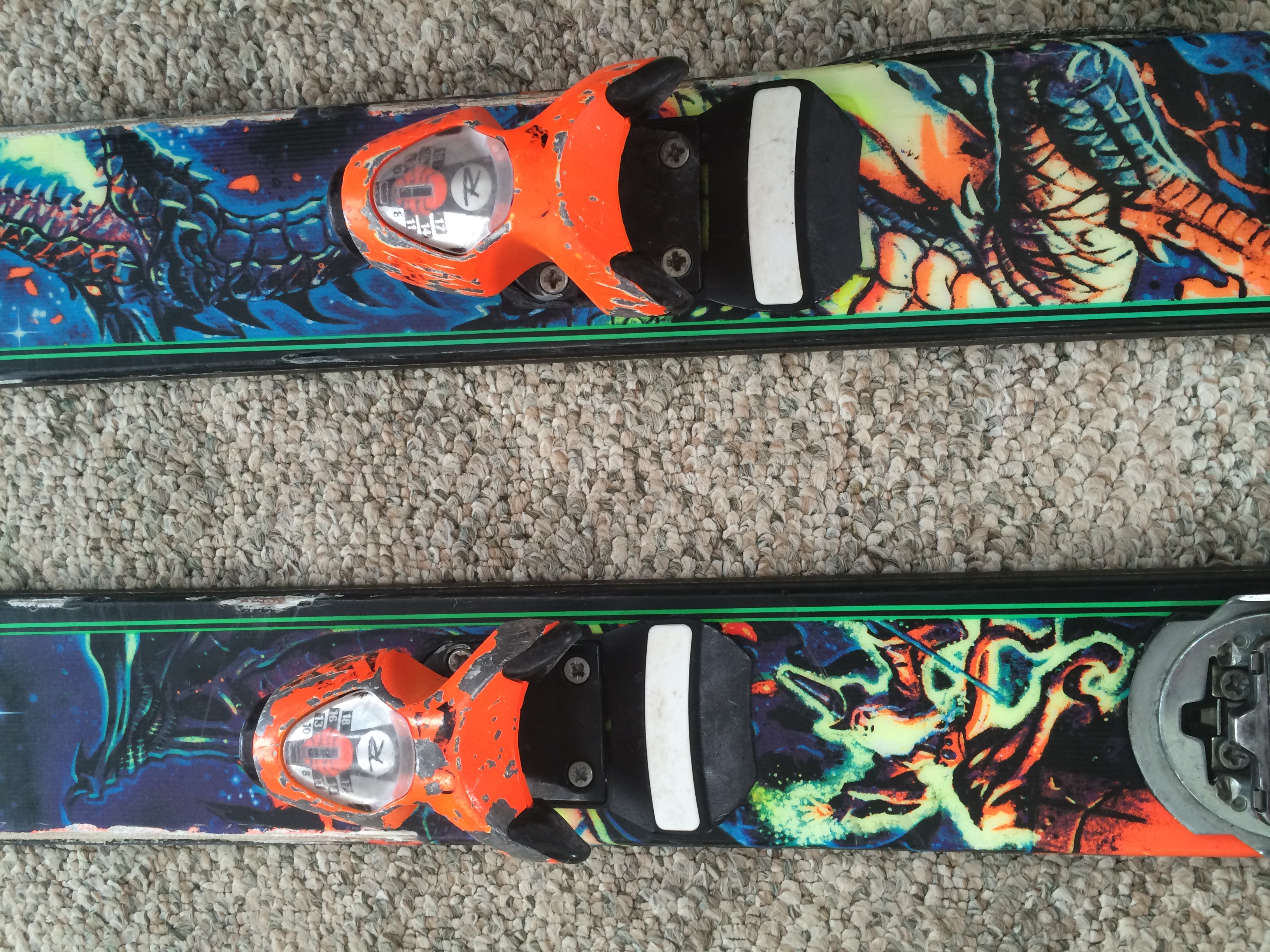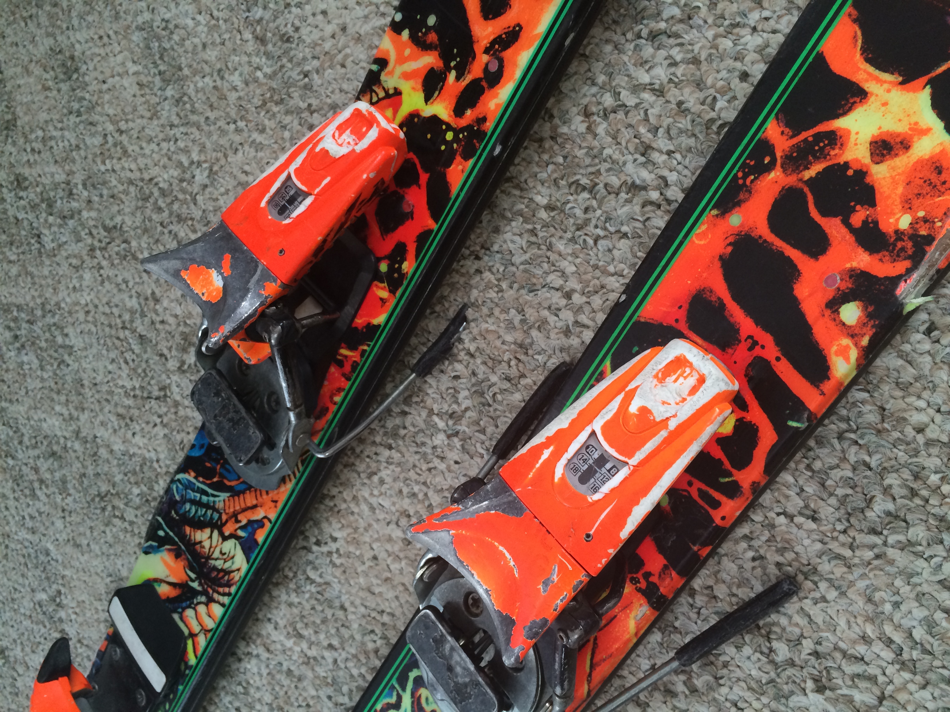 The paint has worn off a lot but has absolutely no effect on how it performs what so ever. They are still in pretty good condition but one binding however does need a new heel plate, so I am gonna let em go for cheap.