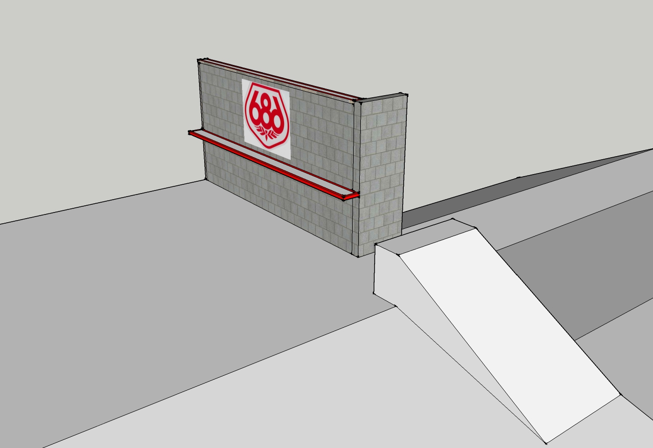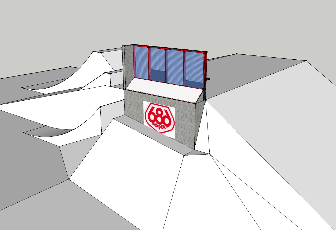 We have updated the computer model since the one that was in blue. Since teaming up with 686, I posted a video above that is the new rendition. The very top of this box is an 8" wide ledge box that will feature its own take off. To skiers left is a creeper ledge that is a 1'1/2 wide and yes halfway down the backside. Yet to be fabricated is the slant box featured below the windows, yet to be installed. Then the whole feature will sit on top of a vertical wallride to act as a ledge drop off. We will adjust the height of this wall with snow and adjust landings accordingly. It's somewhat hard to portray where the snow will be with a sketchup model. As we post more pictures of the fabrication process we hope you will get a better idea.
