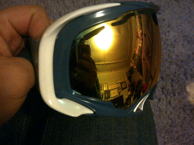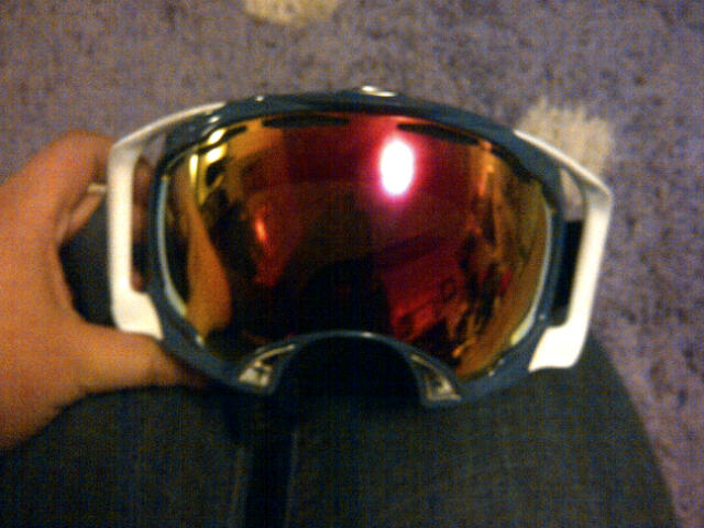 Strap is dyed all black, frame is a dark blue, riggers are white, and the lens is fire. lets start these at 85 OBO.