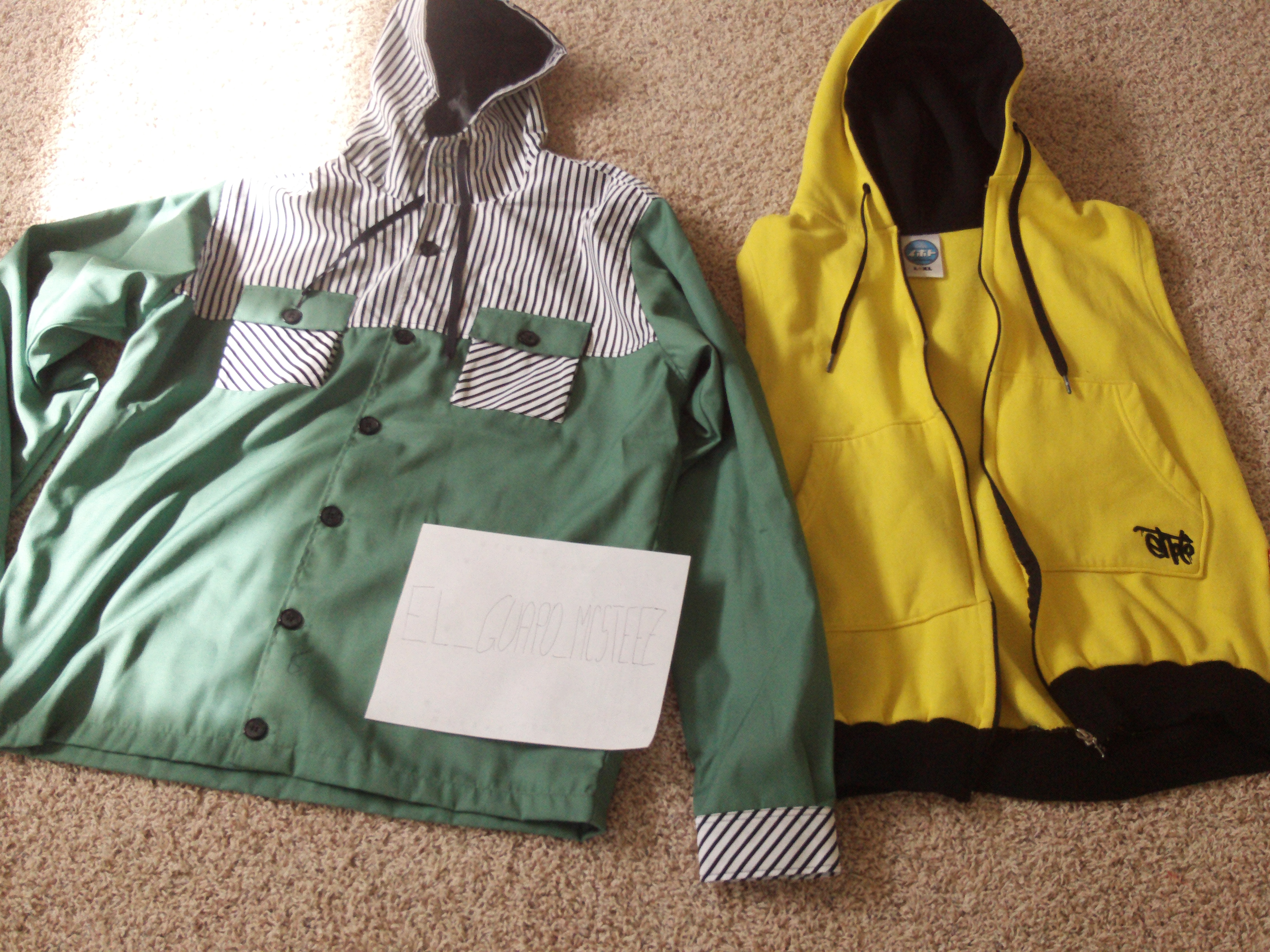 For sale Ehoto yellow Vest, 7/10 the only thing wrong is that i washed it, but besides that its good, size L+XL looking for 40$. Also Brand new Jiberish Pin Swipes 4XL, Perfect condition with tags, I got it and decided its not my style so looking for 55$. Will sell both together for 85$+K for Bumps