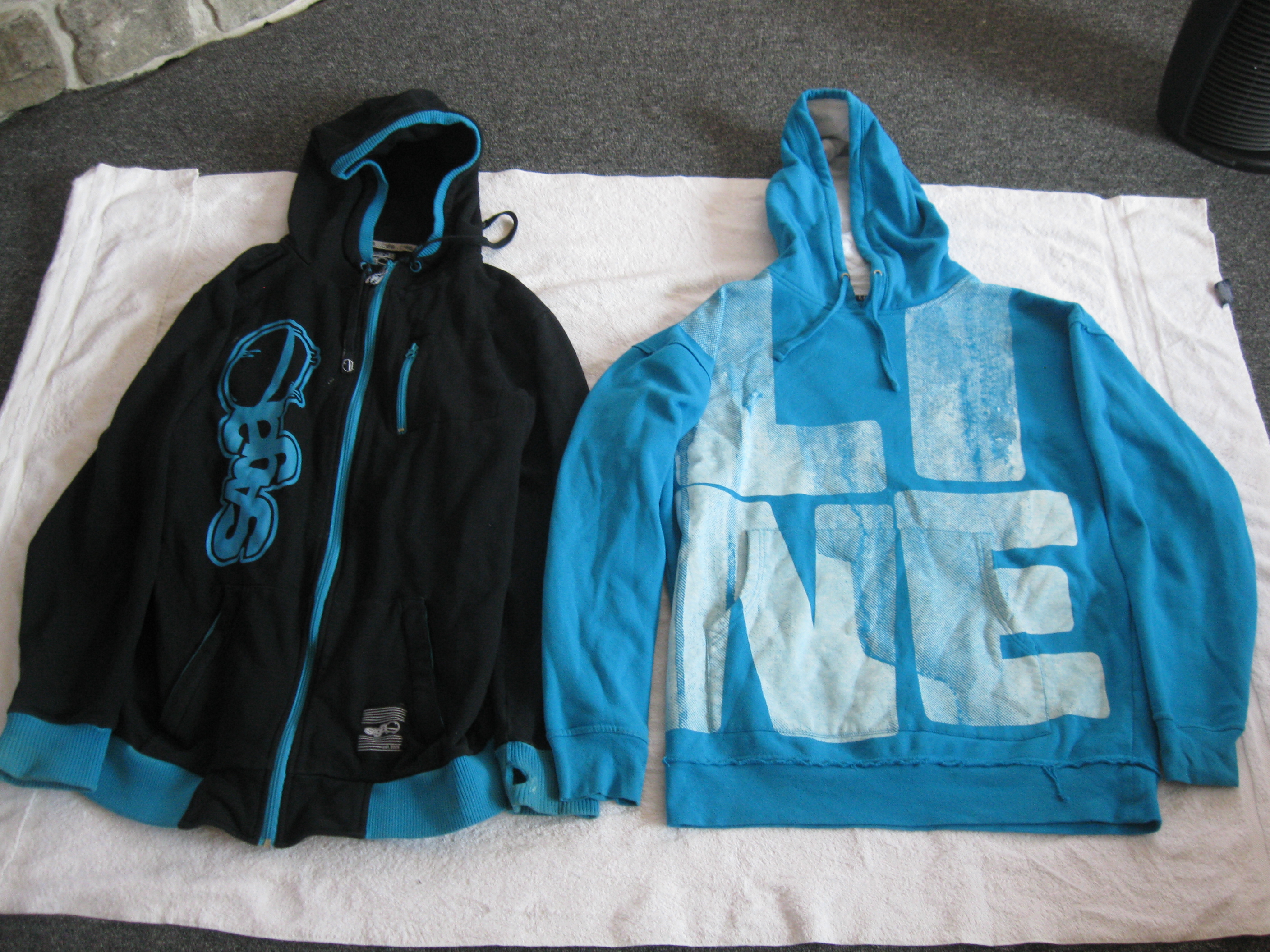 Line hoodie (blue) Size L- 7.5/10 tiny hole in back. not noticeable.