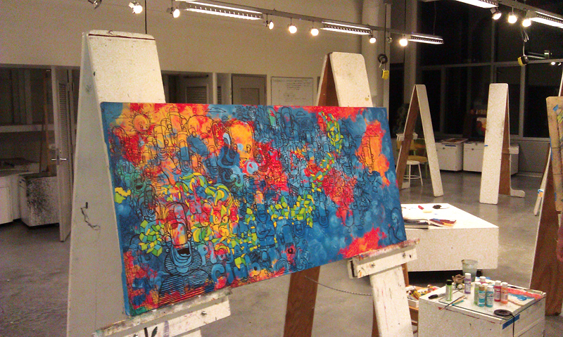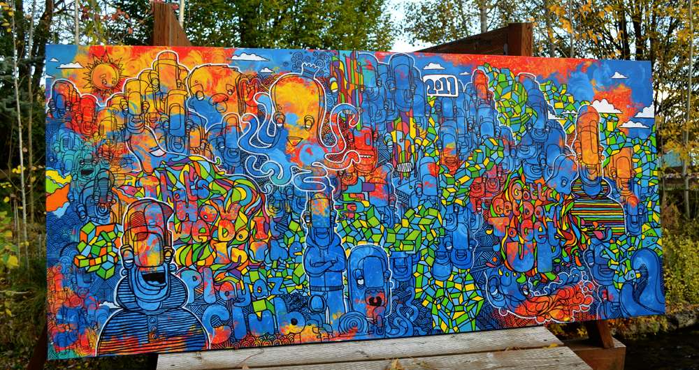 All in all for both designs over 40 hrs of work went into them. A hand done acrylic painting was used for the gas mask imagery and a combination of pen and ink drawing over a halfway done land scape mixed media painting of the tetons for the skull entry.
