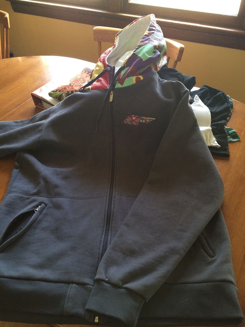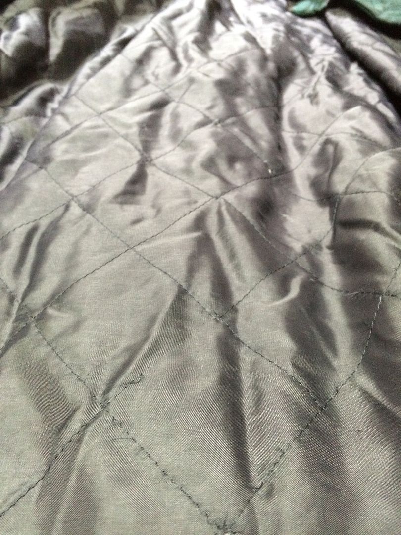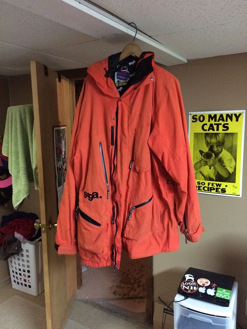 L saga lobster. probably a 6/10, synch cord at bottom only works on one side, lot of pilling, couple minor rips, definately shows its age, still a classic. Zipper is 35 inches. $40